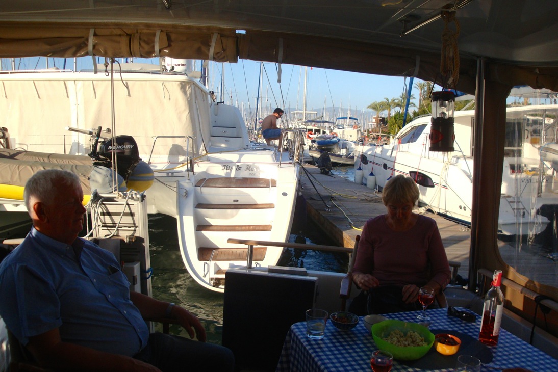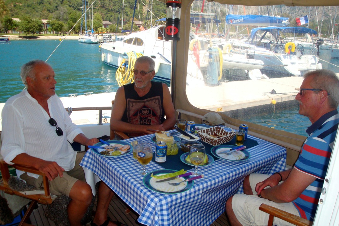 Lotta och Håkan har mönstrat på i Göcek. Här har vi fått besök av Royne med S/Y Elina som ligger för ankare i viken jämte oss. Herrarna löser världsproblemen.