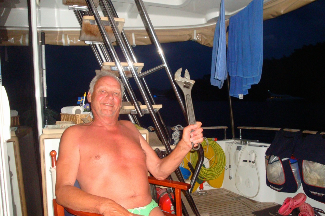 Propellrar, roder och trimplan stryker vi med Velox Plus. 2 gånger primer och 2 gånger Velox. Håller två år utan någon beväxning. Något att tänka på hemma i Sverige. 21 april sjösatte vi Xanto och livet återkomm med raska steg.