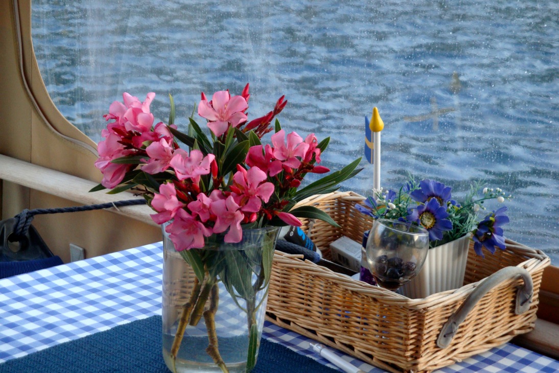 Måven skulle behöva fräschas upp med lite färg, kanske Ahmet fixar detta någon gång de närmsta åren. Tindra låg en bit ifrån oss på boj i Fhantom grave, Harriet och Curt kom över på eftermiddagsfika.